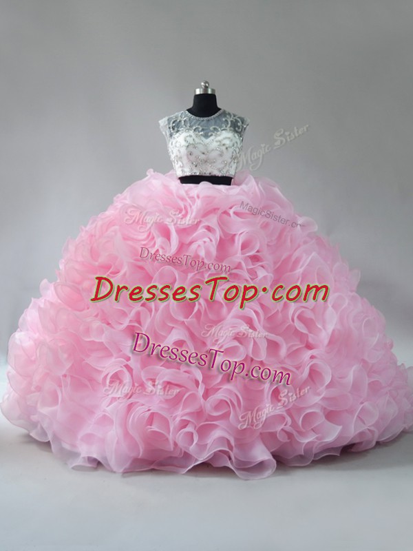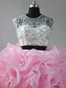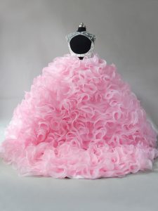 Fabric With Rolling Flowers Sleeveless Quinceanera Gowns Brush Train and Beading and Ruffles