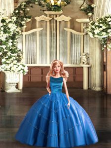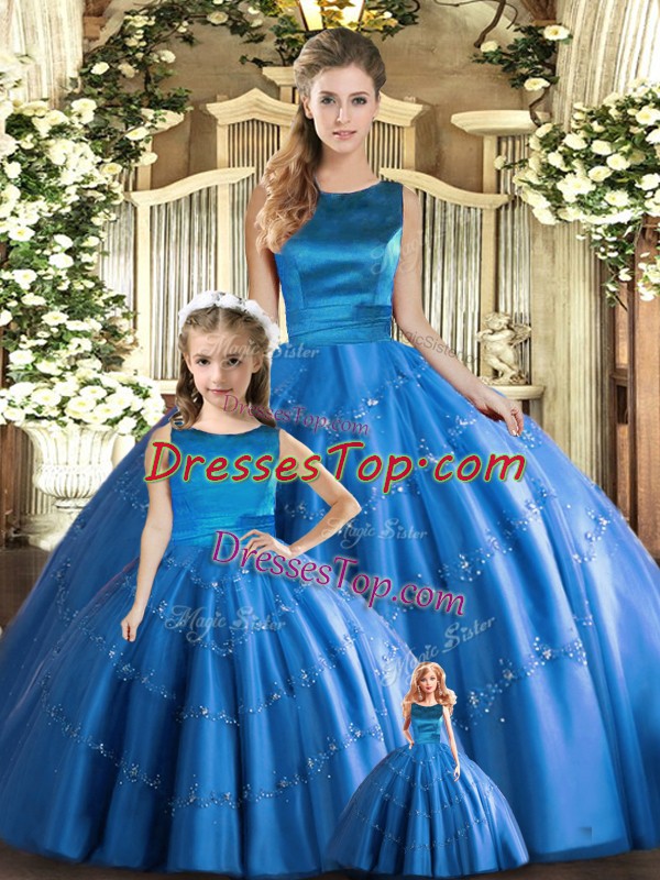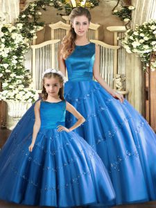 Fabulous Blue Ball Gowns Scoop Sleeveless Tulle Floor Length Lace Up Appliques Quince Ball Gowns