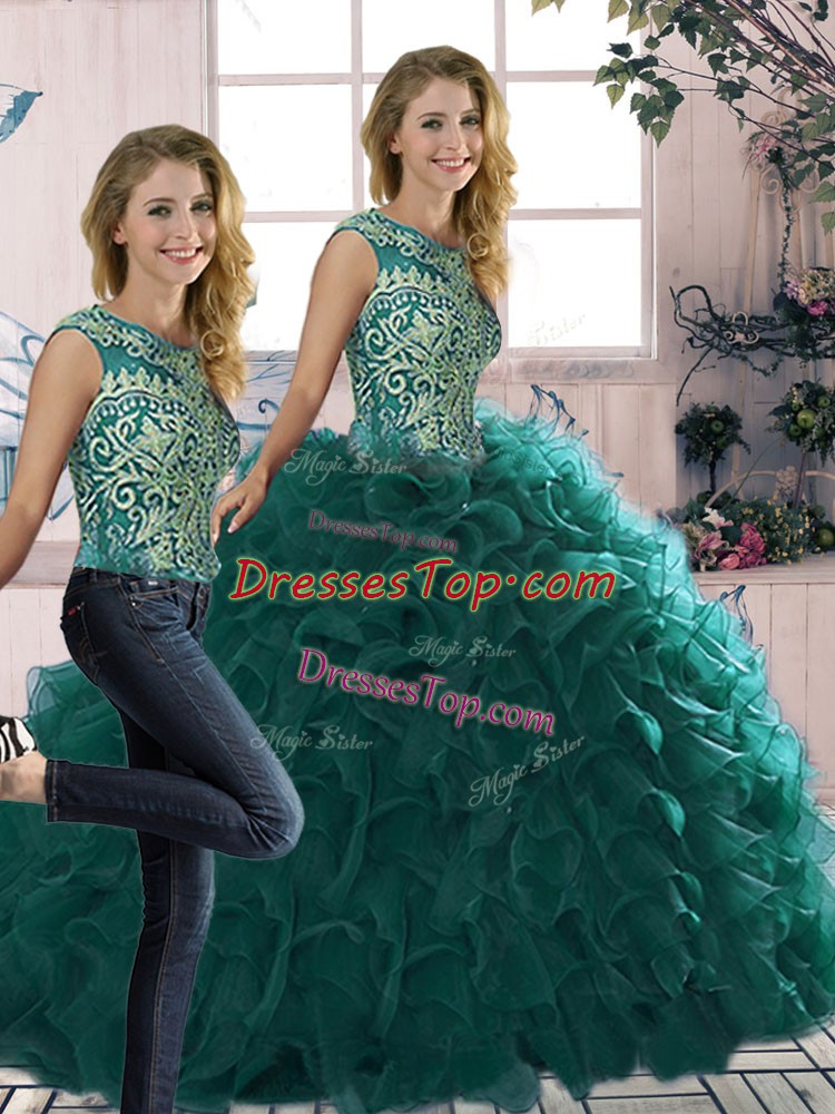 Fabulous Organza Scoop Sleeveless Lace Up Beading and Ruffles Sweet 16 Dresses in Peacock Green