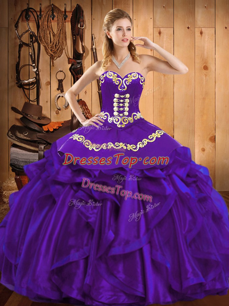 Fabulous Purple Sleeveless Floor Length Embroidery and Ruffles Lace Up Quinceanera Gowns