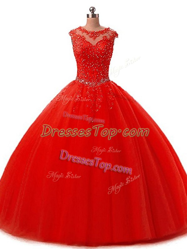 Fabulous Red Ball Gowns Tulle Scoop Sleeveless Beading and Lace Floor Length Lace Up Quinceanera Gowns