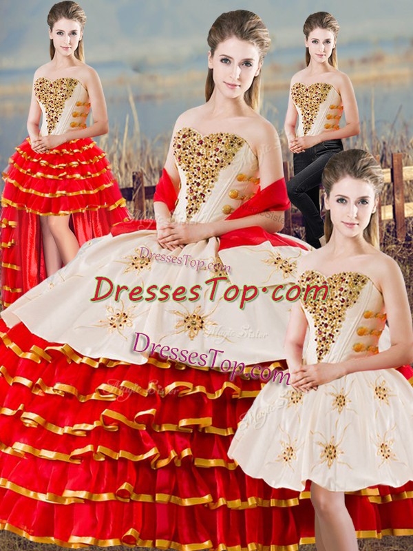 Fabulous Sleeveless Organza Floor Length Lace Up Quinceanera Gown in White And Red with Beading and Ruffled Layers