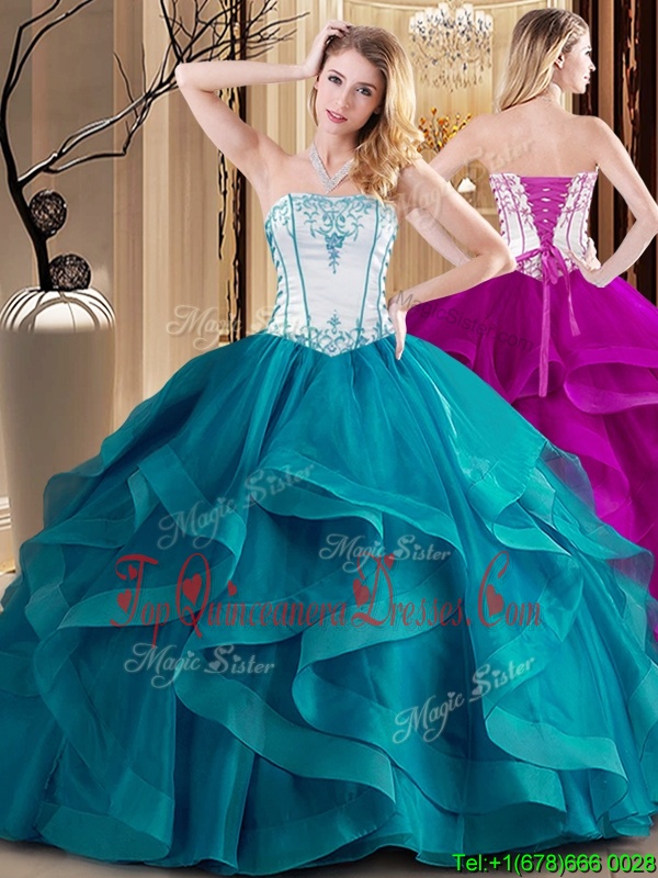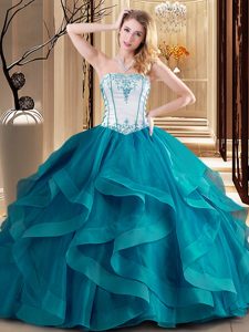 Fabulous Teal Strapless Neckline Embroidery Quinceanera Dresses Sleeveless Lace Up