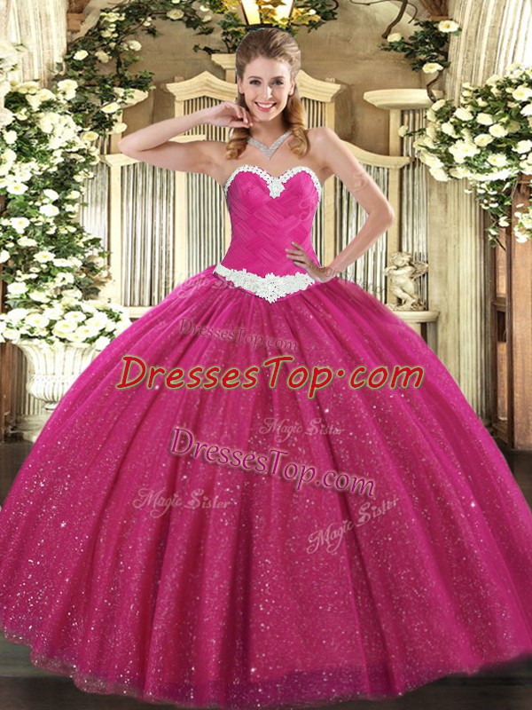 Fabulous Tulle Sweetheart Sleeveless Lace Up Appliques Sweet 16 Dress in Hot Pink