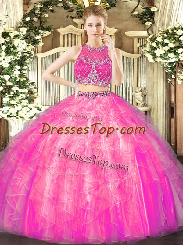 Fabulous Two Pieces Quinceanera Gowns Fuchsia Scoop Tulle Sleeveless Floor Length Zipper
