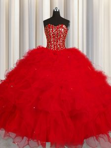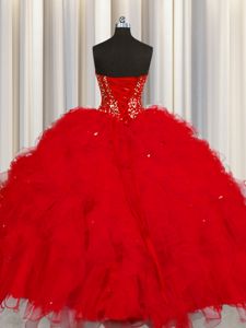 Fabulous Visible Boning Red Tulle Lace Up Ball Gown Prom Dress Sleeveless Floor Length Beading and Ruffles and Sequins