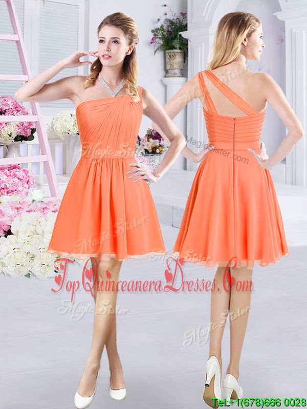Fancy A-line Dama Dress for Quinceanera Orange One Shoulder Chiffon Sleeveless Mini Length Zipper