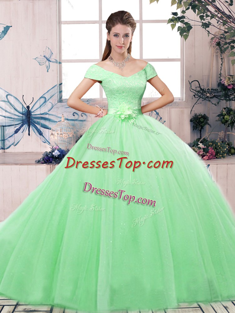Fancy Apple Green Lace Up Off The Shoulder Lace and Hand Made Flower Quinceanera Gown Tulle Short Sleeves