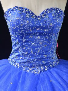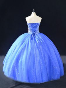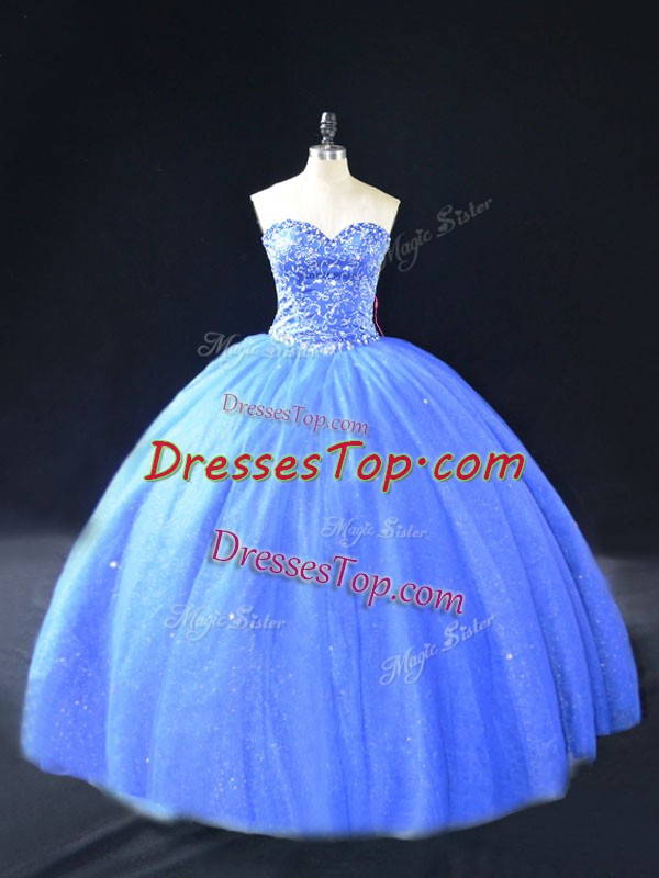 Fancy Blue Tulle Lace Up Sweetheart Sleeveless Floor Length Sweet 16 Dresses Beading