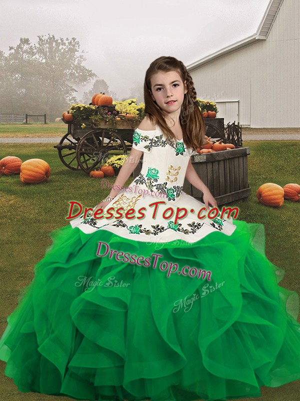 Fancy Floor Length Lace Up Kids Pageant Dress Green and In with Embroidery and Ruffles