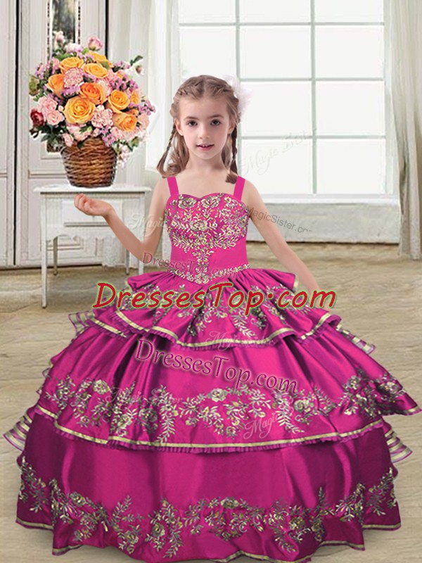 Fancy Fuchsia Ball Gowns Embroidery and Ruffled Layers Kids Pageant Dress Lace Up Satin Sleeveless Floor Length