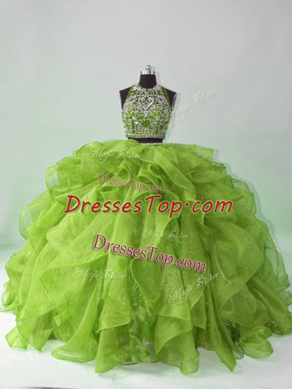 Fancy Green Organza Backless Quinceanera Dress Sleeveless Brush Train Beading and Ruffles