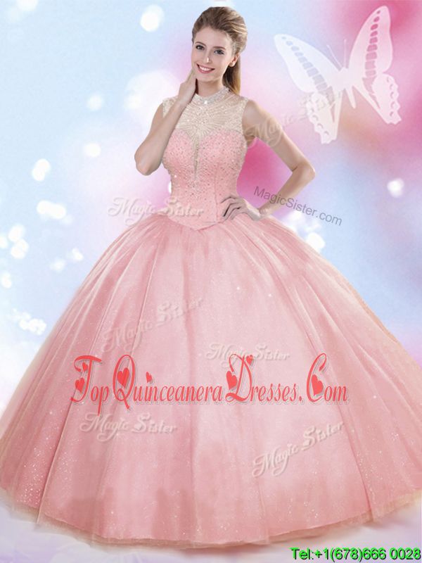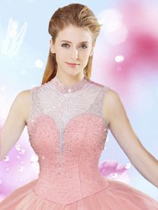 Fancy High-neck Sleeveless Tulle Quinceanera Gowns Beading Lace Up