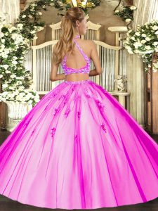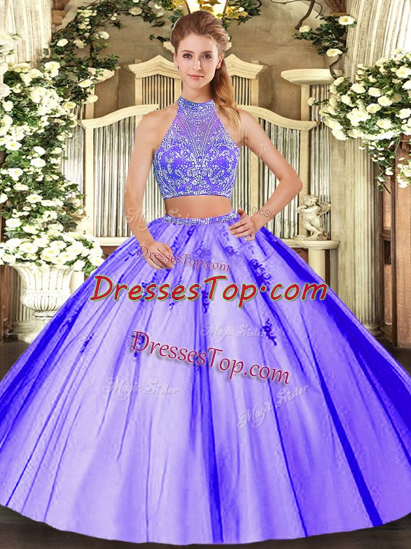 Fancy Lavender Halter Top Neckline Beading Quince Ball Gowns Sleeveless Criss Cross