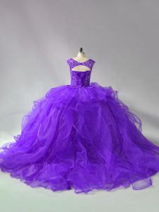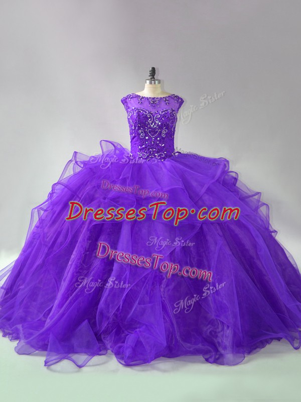 Fancy Purple Scoop Lace Up Beading and Ruffles Quinceanera Dress Brush Train Sleeveless