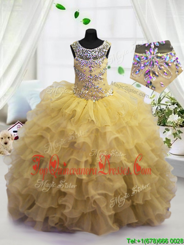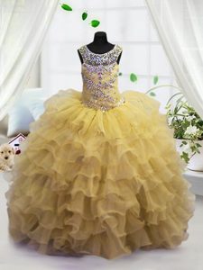 Fancy Scoop Beading and Ruffled Layers Little Girls Pageant Gowns Light Yellow Lace Up Sleeveless Floor Length
