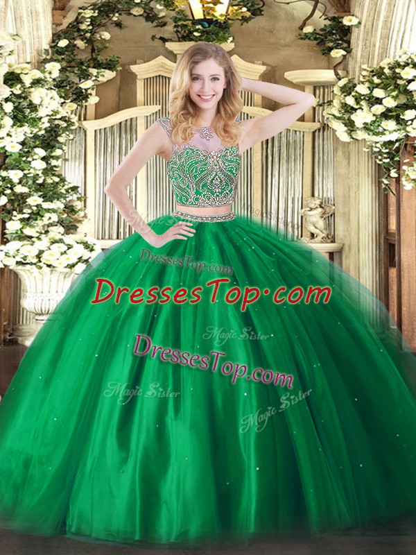 Fancy Scoop Sleeveless Quince Ball Gowns Floor Length Beading Green Tulle