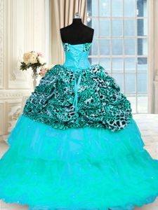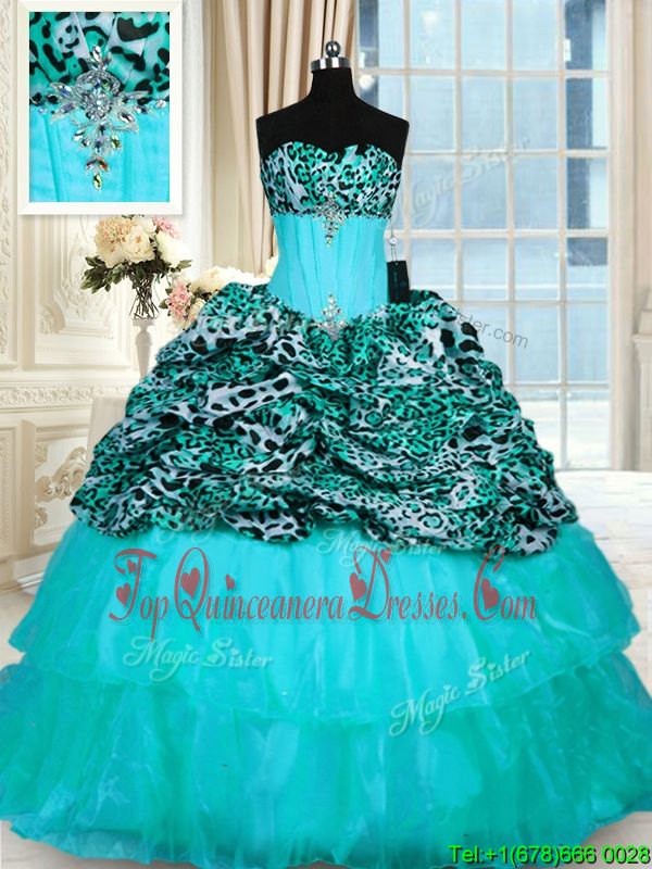 Fantastic Aqua Blue Ball Gowns Beading and Ruffled Layers 15th Birthday Dress Lace Up Organza and Printed Sleeveless