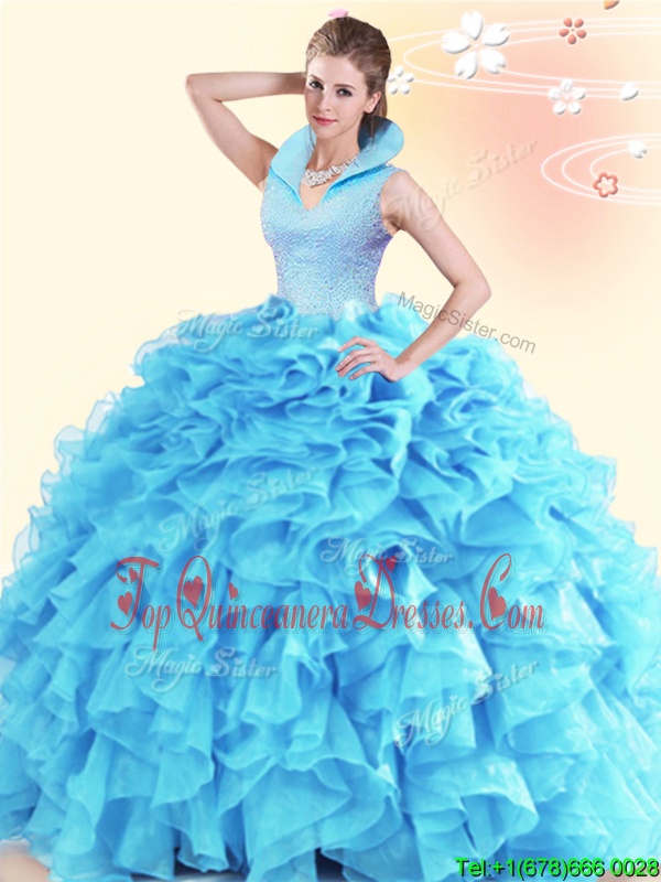 Fantastic Aqua Blue Ball Gowns Organza High-neck Sleeveless Beading and Ruffles Floor Length Backless Quince Ball Gowns