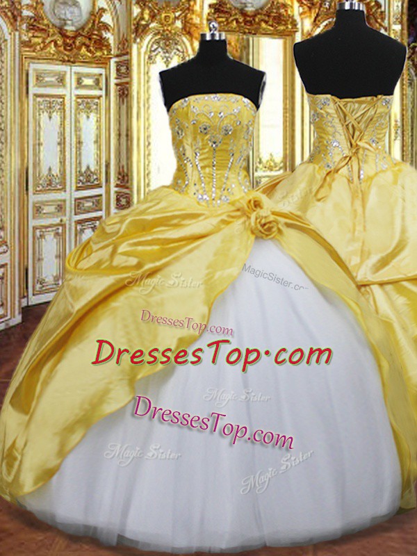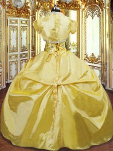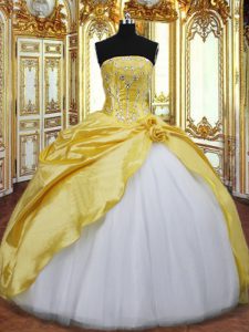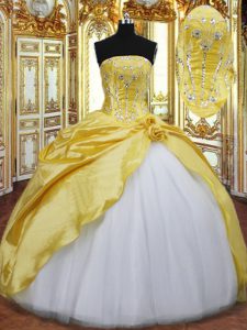 Fantastic Floor Length Gold Quince Ball Gowns Taffeta Sleeveless Beading and Hand Made Flower