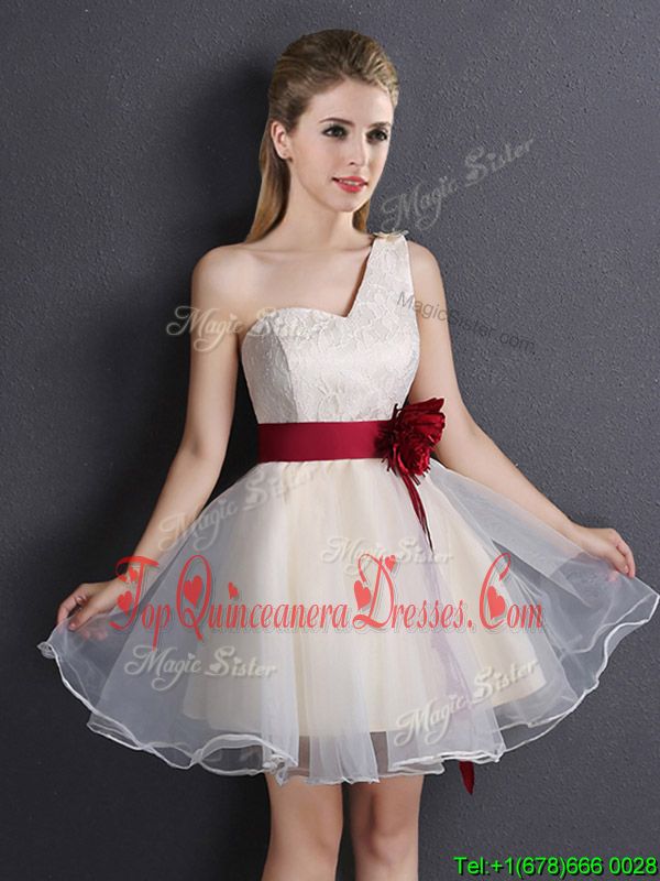 Fantastic One Shoulder Champagne Lace Up Quinceanera Court of Honor Dress Lace and Hand Made Flower Sleeveless Mini Length