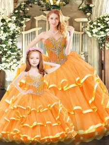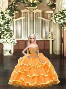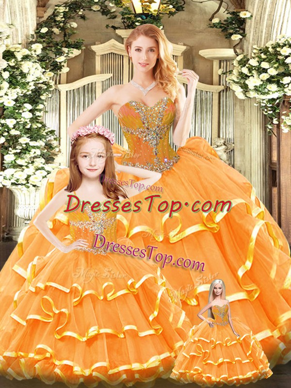 Fantastic Orange Red Ball Gowns Beading and Ruffled Layers 15th Birthday Dress Lace Up Tulle Sleeveless Floor Length