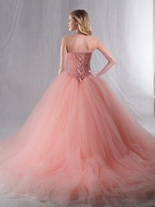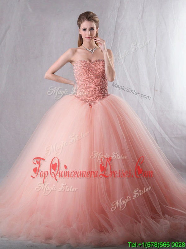 Fantastic Peach Sleeveless Brush Train Beading With Train Vestidos de Quinceanera