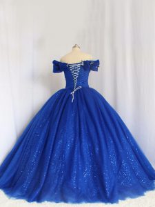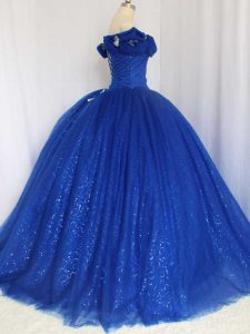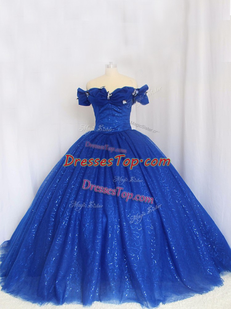 Fantastic Royal Blue Ball Gowns Hand Made Flower Sweet 16 Dress Lace Up Tulle Cap Sleeves Floor Length