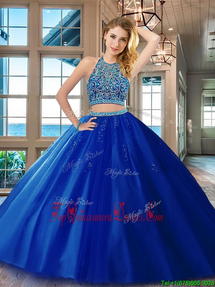 Fantastic Royal Blue Tulle Backless Scoop Sleeveless Floor Length 15 Quinceanera Dress Beading