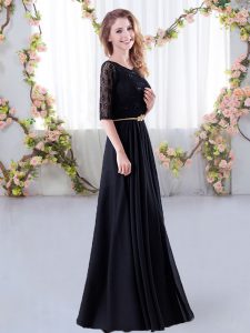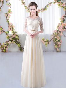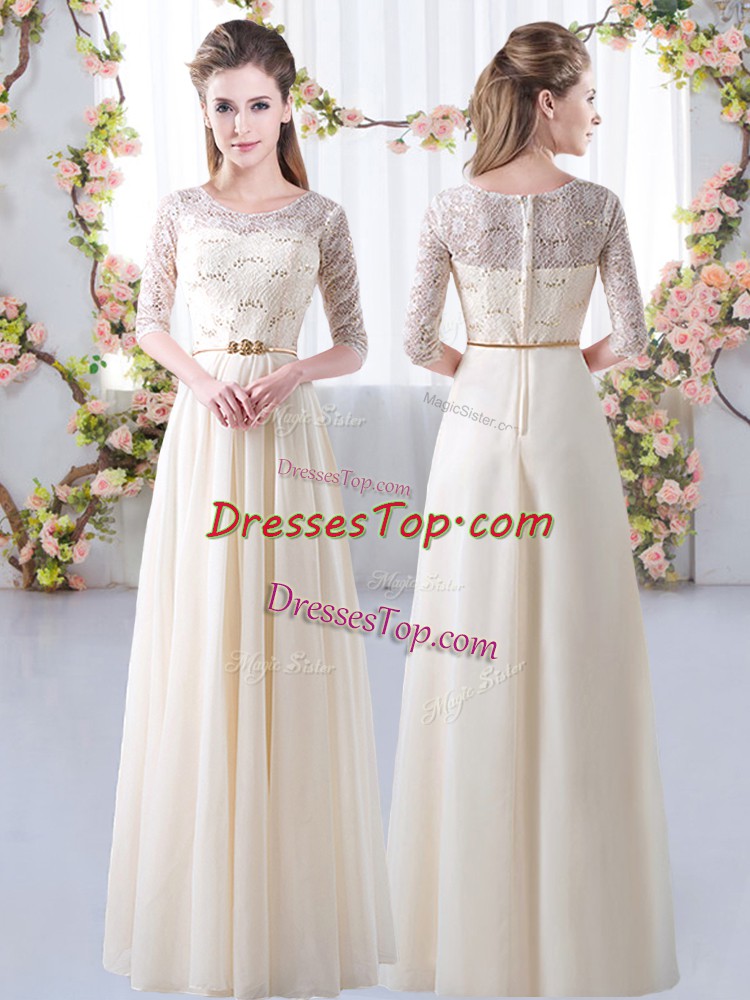 Fantastic Scoop Half Sleeves Court Dresses for Sweet 16 Floor Length Lace and Belt Champagne Chiffon