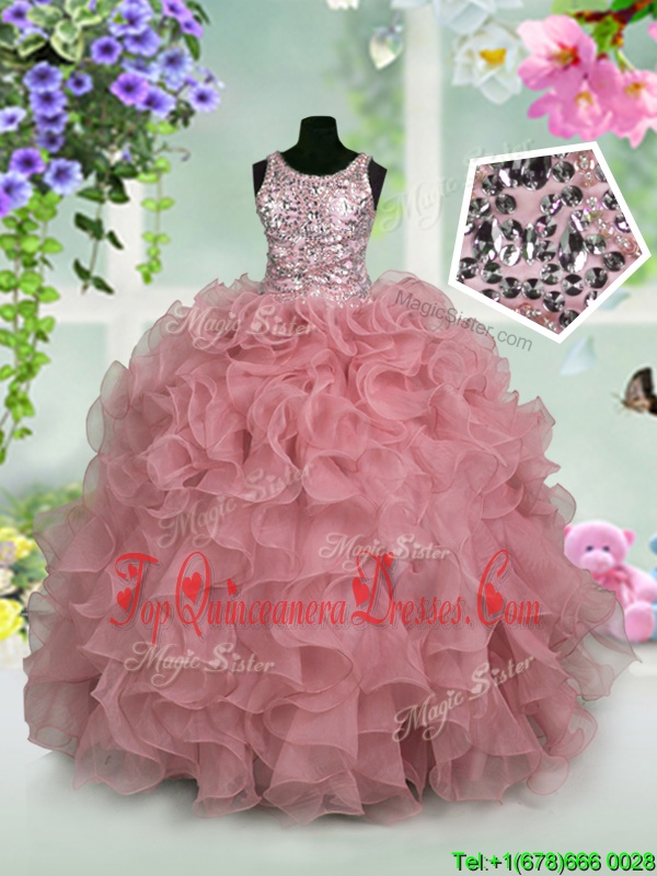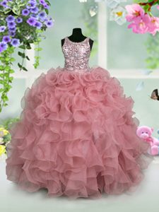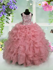 Fantastic Scoop Pink Zipper Pageant Dress for Girls Ruffles and Sequins Sleeveless Floor Length
