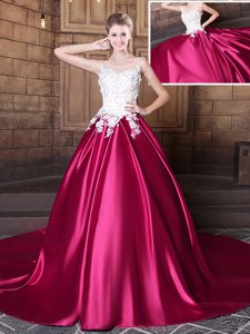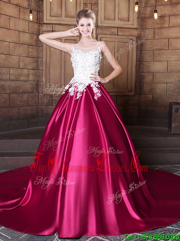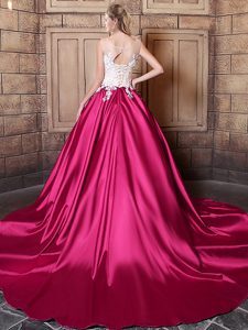 Fantastic Scoop Sleeveless Lace and Appliques Lace Up Sweet 16 Dress with Hot Pink Court Train