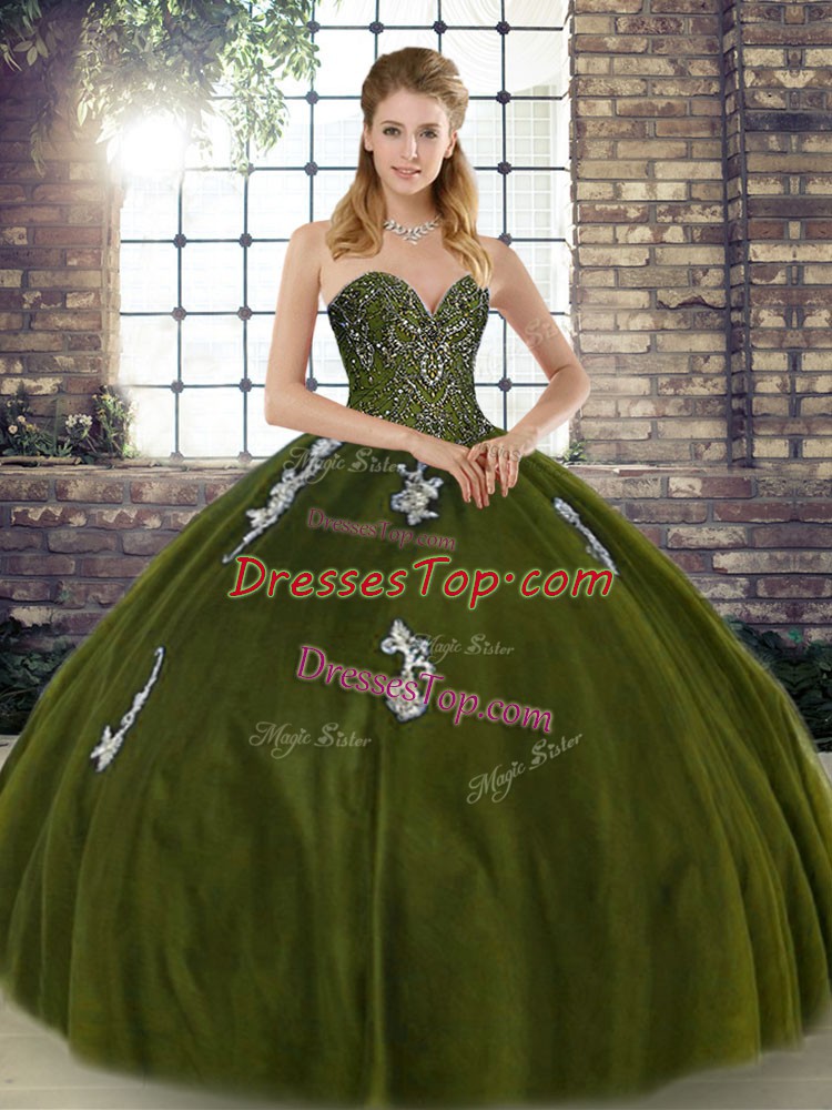 Fantastic Sleeveless Floor Length Beading and Appliques Lace Up Sweet 16 Dresses with Olive Green