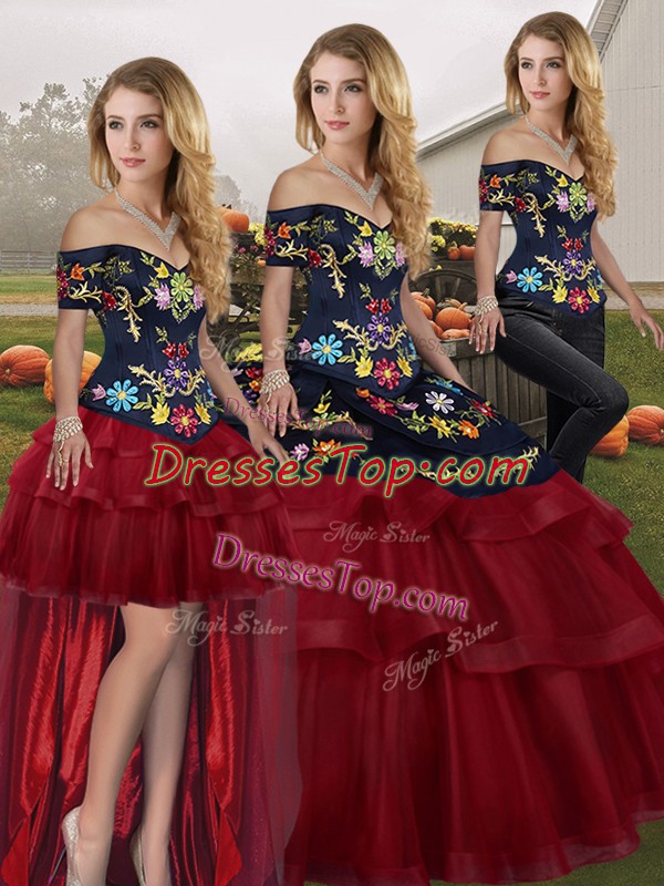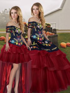 Fantastic Sleeveless Tulle Brush Train Lace Up Sweet 16 Dress in Wine Red with Embroidery and Ruffled Layers