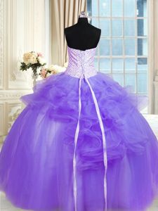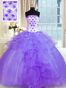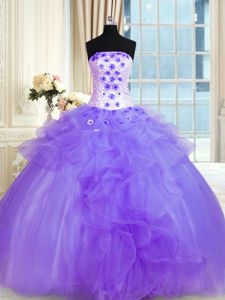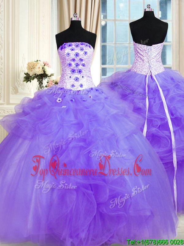 Fantastic Sleeveless Tulle Floor Length Lace Up Vestidos de Quinceanera in Lavender for with Pick Ups and Hand Made Flower