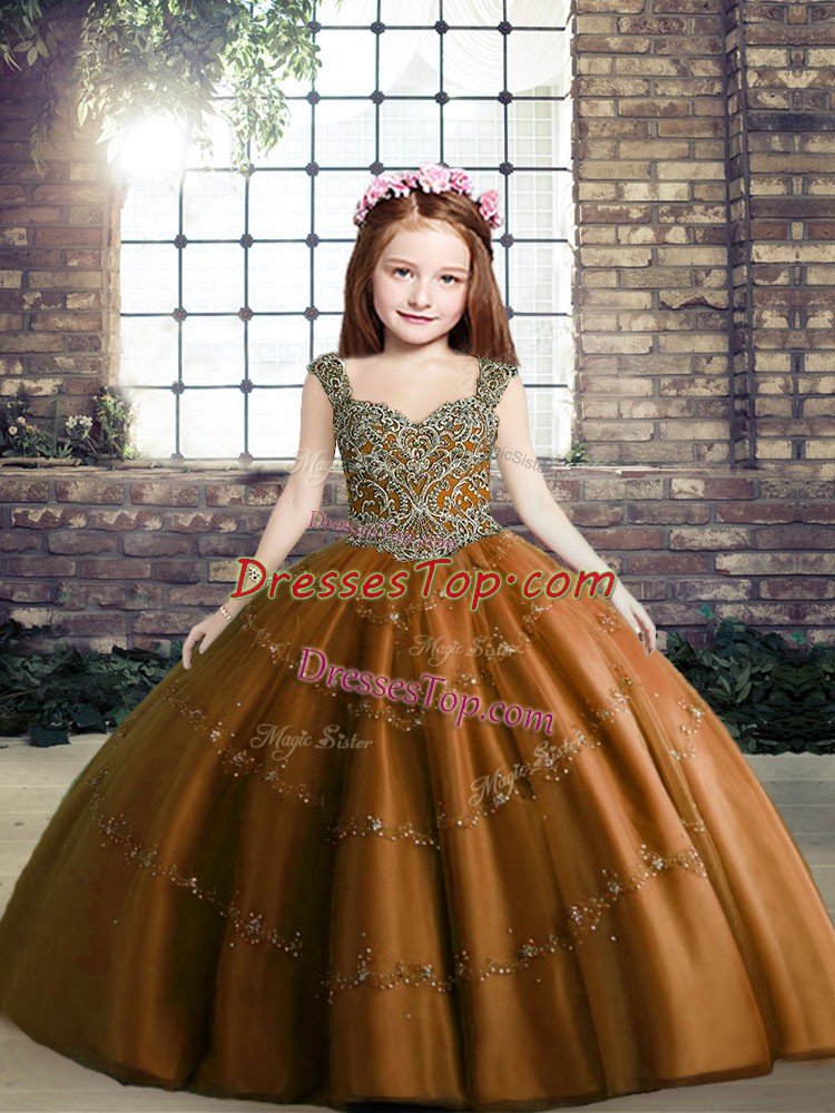 Fantastic Straps Sleeveless Little Girl Pageant Gowns Floor Length Beading Brown Tulle