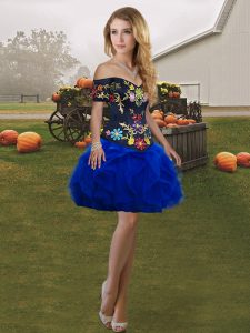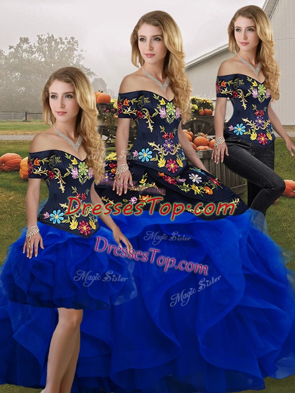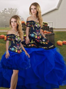 Fantastic Tulle Off The Shoulder Sleeveless Lace Up Embroidery and Ruffles Sweet 16 Dresses in Royal Blue