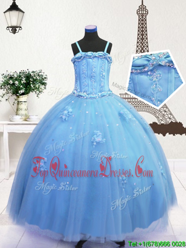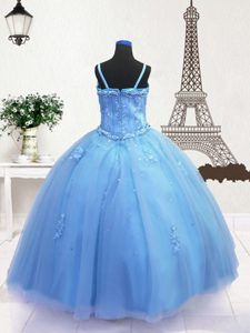 Fantastic Tulle Spaghetti Straps Sleeveless Zipper Beading and Appliques Little Girls Pageant Dress in Baby Blue
