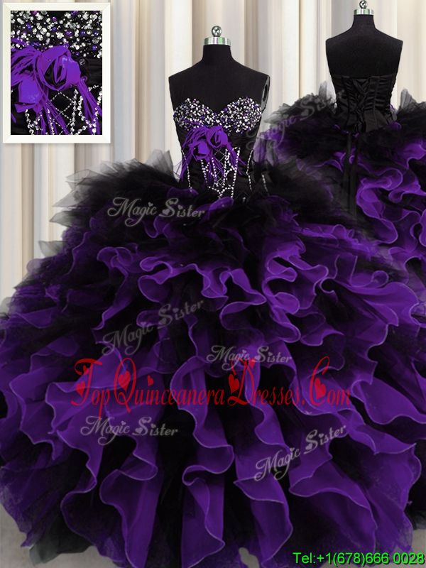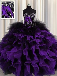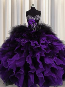 Fantastic Visible Boning Bling-bling Sweetheart Sleeveless Quinceanera Dress With Brush Train Beading and Ruffles Dark Purple Organza