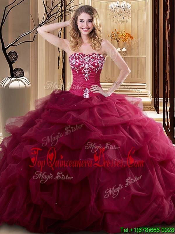 Fantastic Wine Red Ball Gowns Sweetheart Sleeveless Tulle Floor Length Lace Up Embroidery and Ruffles Quinceanera Gowns