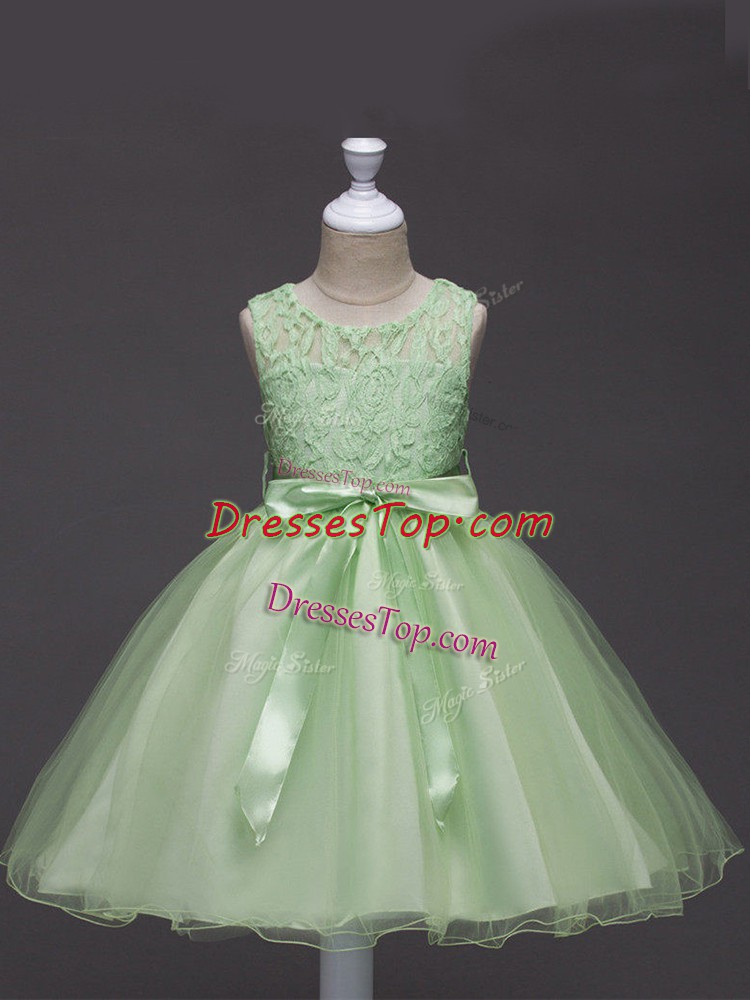 Fantastic Yellow Green Tulle Zipper Pageant Gowns For Girls Sleeveless Knee Length Lace and Belt