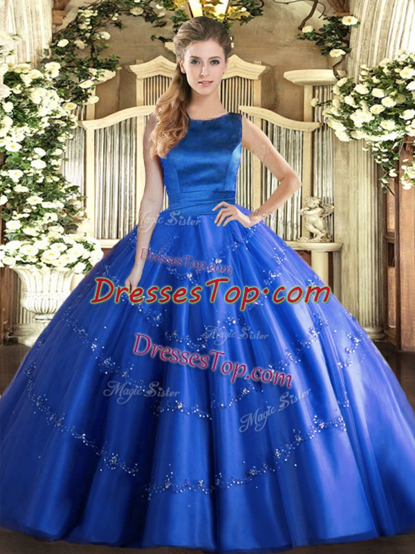 Fashion Blue Scoop Lace Up Appliques Quinceanera Dress Sleeveless