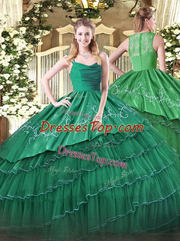 Fashion Dark Green Straps Neckline Embroidery and Ruffled Layers Quinceanera Gown Sleeveless Zipper