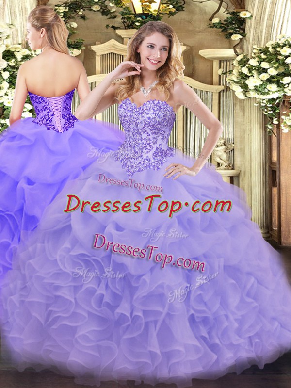 Fashion Floor Length Lavender 15 Quinceanera Dress Organza Sleeveless Appliques and Ruffles