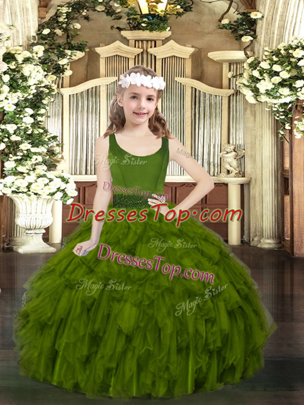 Fashion Floor Length Olive Green Kids Pageant Dress Organza Sleeveless Beading and Ruffles