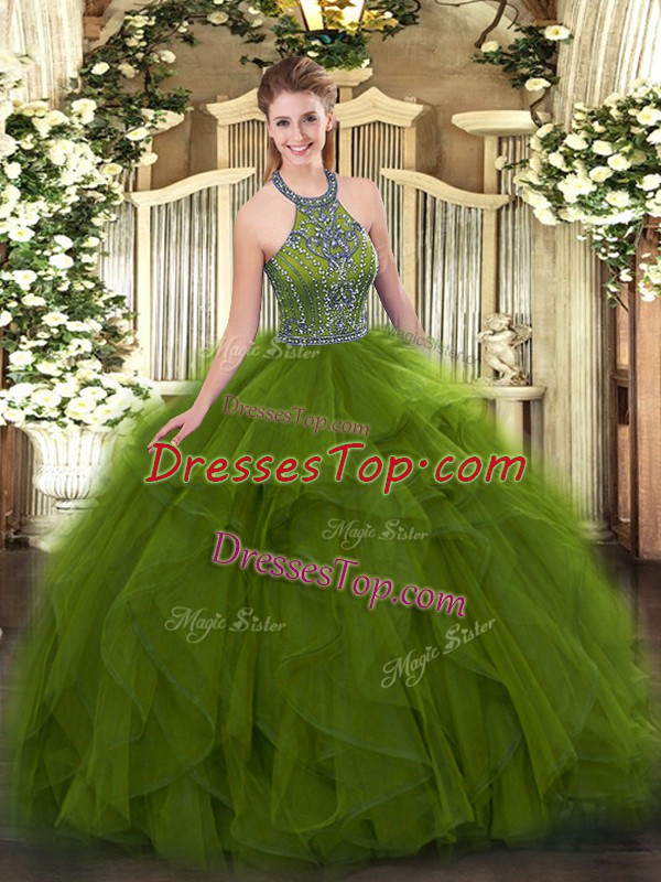 Fashion Floor Length Olive Green Quinceanera Gown Tulle Sleeveless Beading and Ruffles