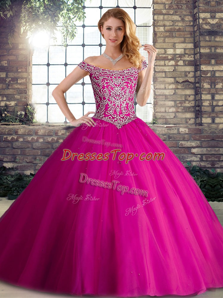 Fashion Off The Shoulder Sleeveless Vestidos de Quinceanera Brush Train Beading Fuchsia Tulle