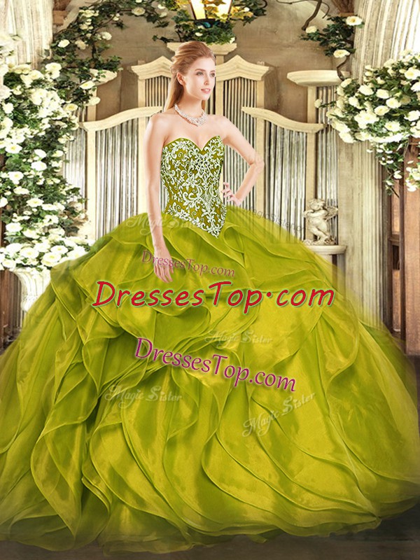 Fashion Olive Green Ball Gowns Beading and Ruffles Sweet 16 Dress Lace Up Organza Sleeveless Floor Length