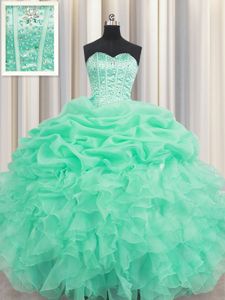 Fashion Organza Sleeveless Floor Length Quince Ball Gowns and Beading and Ruffles and Pick Ups