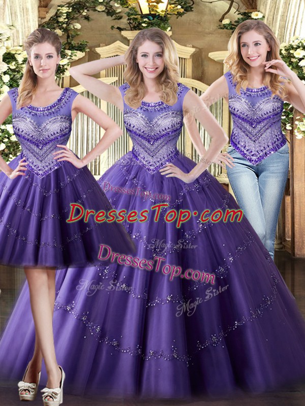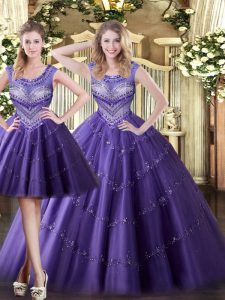 Fashion Scoop Sleeveless 15 Quinceanera Dress Floor Length Beading Purple Tulle
